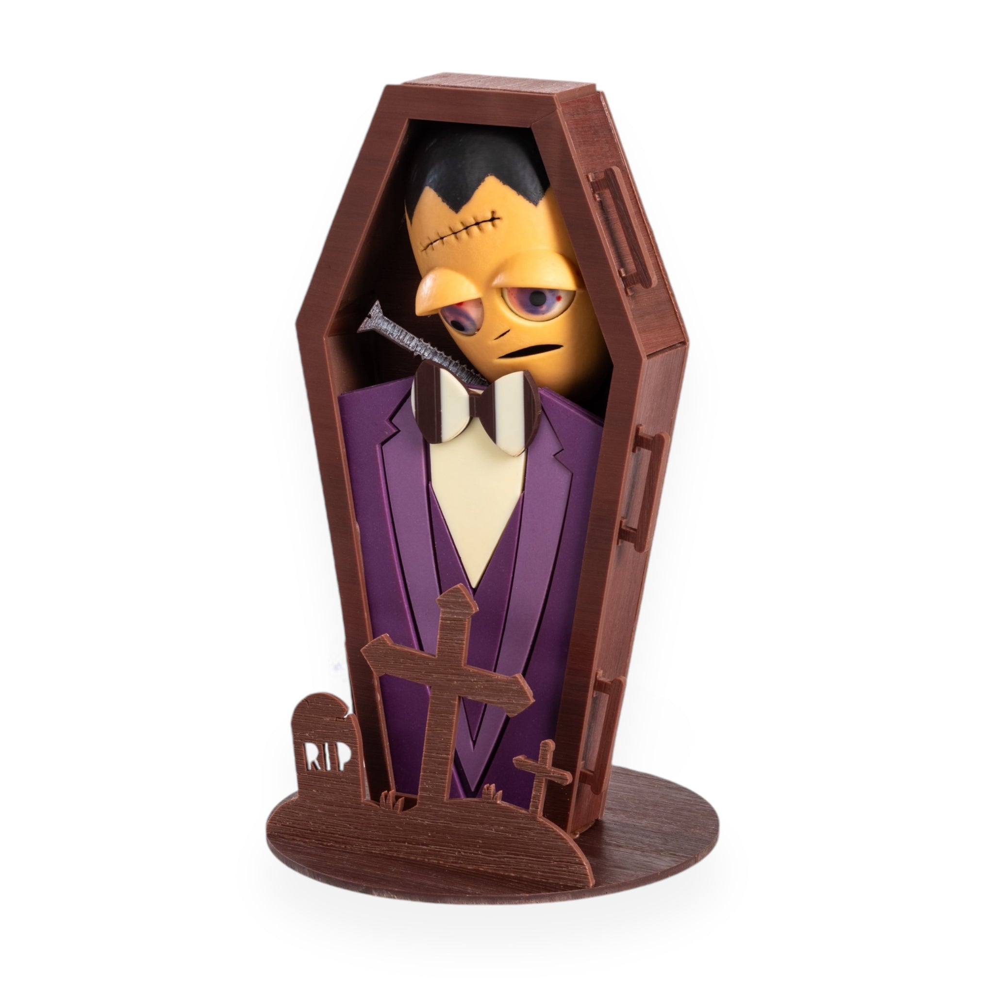 Sujet « Cercueil Frankenstein », montage assemblé minutieusement à la main entièrement en chocolat, composé de chocolat au lait, blanc et noir.