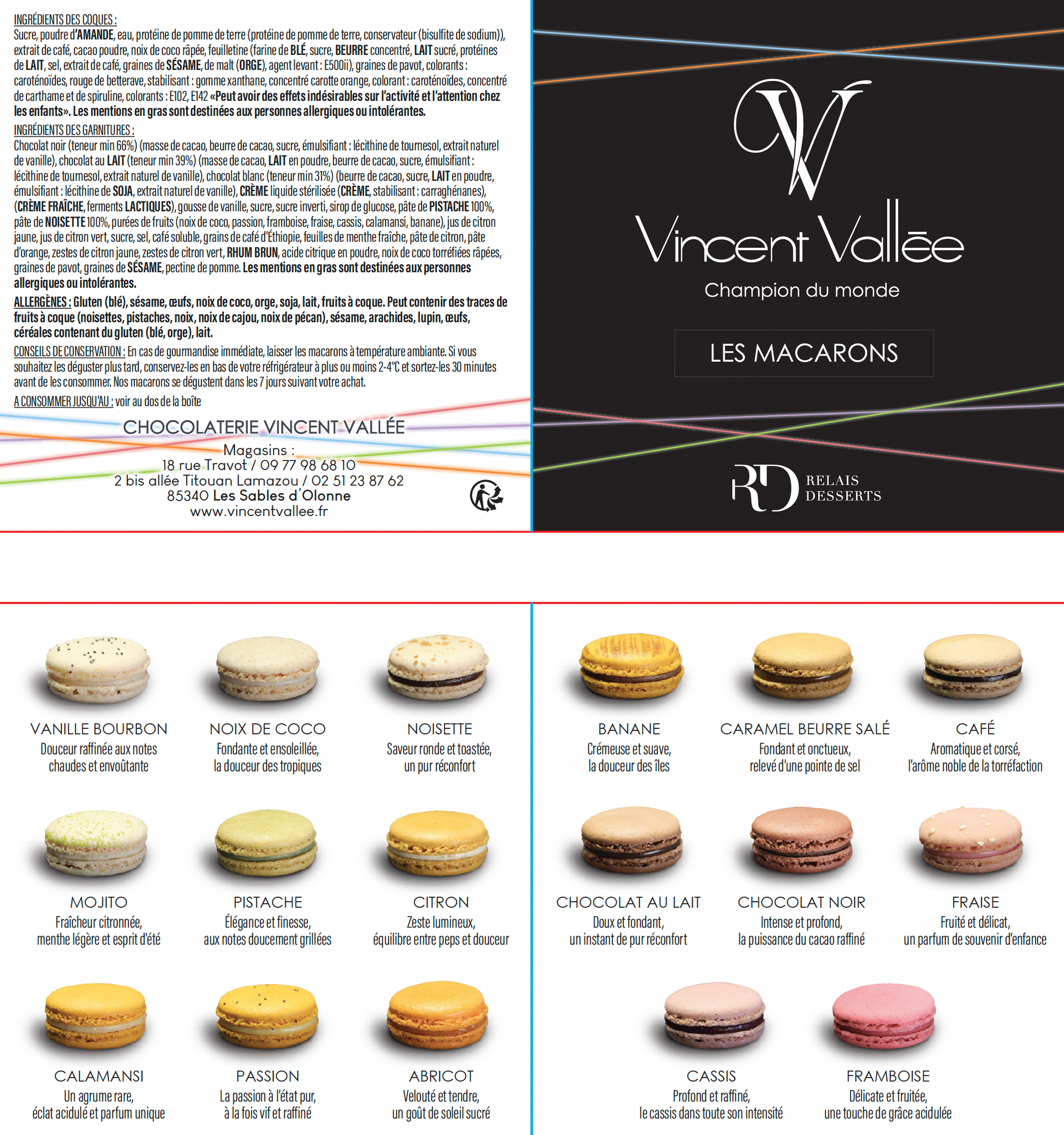 GARNITURES : Chocolat noir (teneur min 66%) (masse de cacao, beurre de cacao, sucre, émulsifiant : lécithine de tournesol, extrait naturel de vanille), chocolat au lait (teneur min 39%) (masse de cacao, LAIT en poudre, beurre de cacao, sucre, émulsifiant : lécithine de tournesol, extrait naturel de vanille), chocolat blanc (teneur min 31%) (beurre de cacao, sucre, LAIT en poudre, émulsifiant : lécithine de SOJA, extrait naturel de vanille), CRÈME liquide stérilisée (CRÈME, stabilisant : carraghénanes), (CRÈME FRAÎCHE, ferments LACTIQUES), gousse de vanille, sucre, sucre inverti, sirop de glucose, pâte de PISTACHE 100%, pâte de NOISETTE 100%, purées de fruits (noix de coco, passion, framboise, fraise, cassis, calamansi, banane), jus de citron jaune, jus de citron vert, sucre, sel, café soluble, grains de café d'Éthiopie, feuilles de menthe fraîche, pâte de citron, pâte d’orange, zestes de citron jaune, zestes de citron vert, RHUM BRUN, acide citrique en poudre , NOIX DE COCO torréfiées râpées, graines de pavot, graines de SÉSAME, pectine de pomme.
